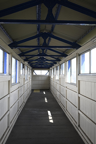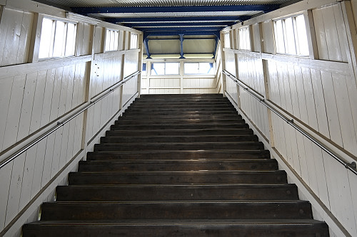 跨線橋の階段部の斜め桁が、細いフラットバーによるトラス構造となっているが珍しい。