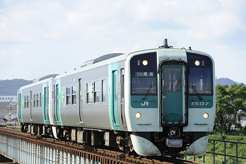 Diesel Train 1500 series」と標記され、車両正面同様配色も変更されている。内装車内配色が従来の木目調のほか、白色も使用されている。床面は灰色に変更され、出入口部は1次車より青色のノンスリップタイプを使用していたが、7次車から注意喚起を示すため黄色に変更された。この他、出入口部関係では鴨居下部にドア開閉案内として赤色LEDを新設し開閉直前および開閉中は点滅する。座席部は緑系モケットの転換クロスシートに加え、新たに片持ちバケット式ロングシートを千鳥配置としており、着座定員確保や車内スペースの拡大を図っている。優先座席部では座席のモケットを青色に塗り分け、優先座席標記はマタニティーマーク入りの新デザインの物に変更されている。またJR四国で初めてLCD式の運賃表示器を採用し、従来車内案内表示器のあった場所に設置されている。ツーマン時は運賃表表示を省略し、次駅案内等のみを行っている。