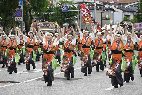 よさこい祭りは毎年8月9日(前夜祭)10日、11日(本番2日)、12日(後夜祭・全国大会)の4日間、高知市内9カ所の競演場・7ヶ所の演舞場で約200チーム、約18,000人の踊り子が手に持った鳴子を鳴らしながら市内を乱舞する土佐のカーニバルです。