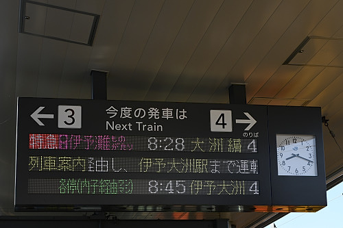 電光掲示が特急「伊予灘ものがたり」の発車案内を告げる。