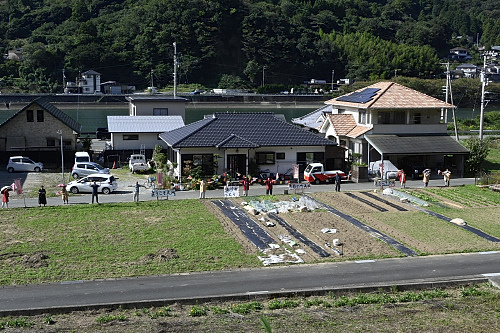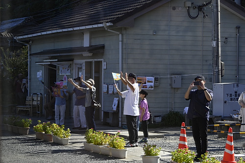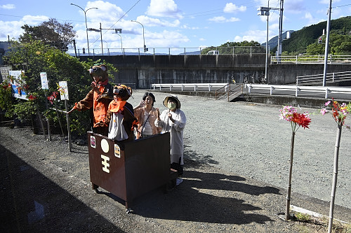 五郎駅をゆっくりと通過。地元の方によるたぬき姿での歓迎。