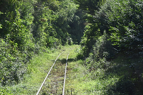 草が生え、ローカル線に転落した予讃線の旧線である予讃線海回り線を行く。